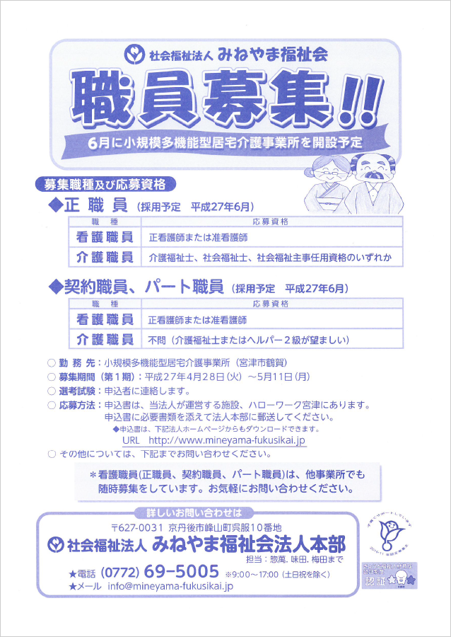 HOME» みねやま福祉会からのお知らせ »【求人情報】宮津小規模多機能型事業所 (はごろも苑みやづの家)の職員を募集します。