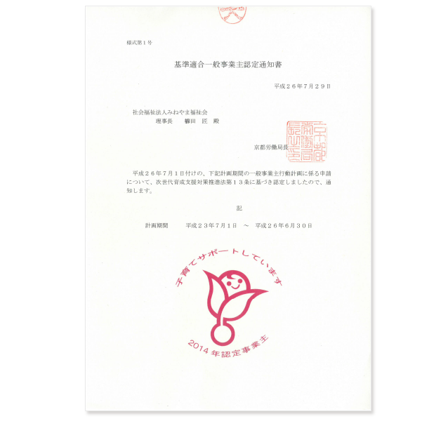 平成26年7月29日付で基準適合一般事業主認定を受けました。