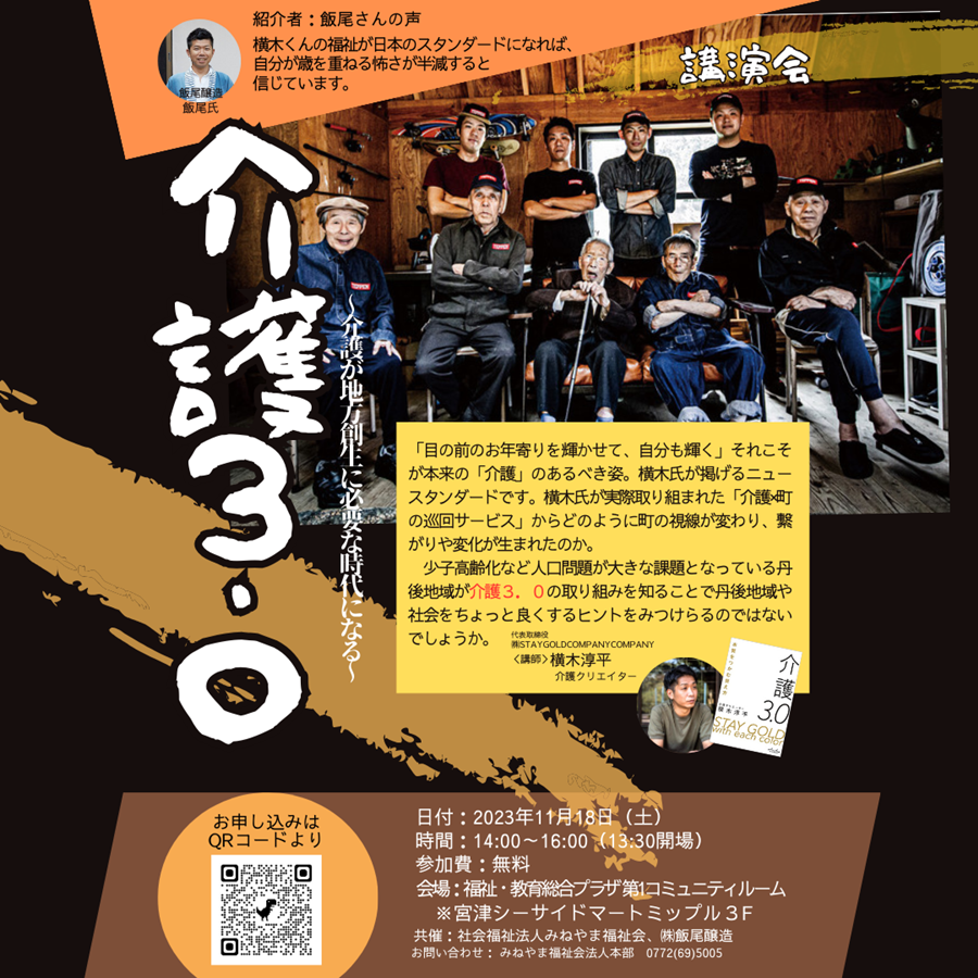 この度、株式会社飯尾醸造(宮津市)と共催で「介護3.0」の提唱者である、横木氏をお迎えして講演会を開催する運びとなりました。