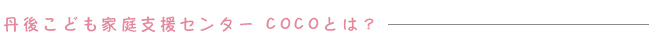 丹後こども家庭支援センターCOCOは、0歳から18歳のお子さんがいるご家庭のための、児童福祉法に基づいた専門相談機関です。地域にお住いのご家庭から、生活や子育て、その他様々な相談を受け、社会福祉士・保育士・臨床心理士等の専門スタッフが必要に応じて他の支援機関と連携し、みんなが安心して過ごせるようにサポートします。